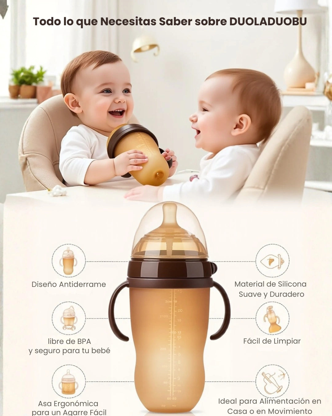 Gracias a su diseño antiderrame innovador, la botella DUOLADUOBU mantiene la leche o fórmula en su lugar, incluso cuando tu bebé está en diferentes posiciones, ya sea acostado, sentado o jugando. Su sistema de sello avanzado asegura que no haya derrames, brindándote más tranquilidad durante la alimentación.